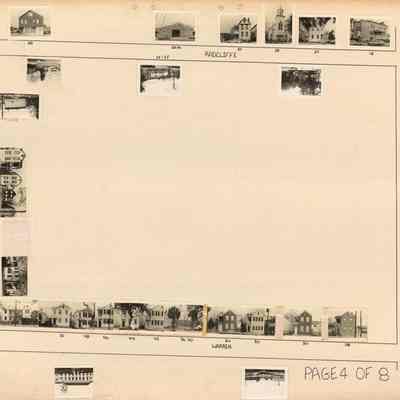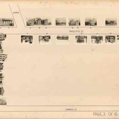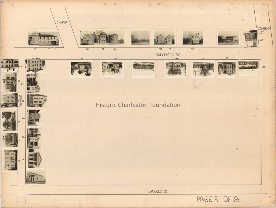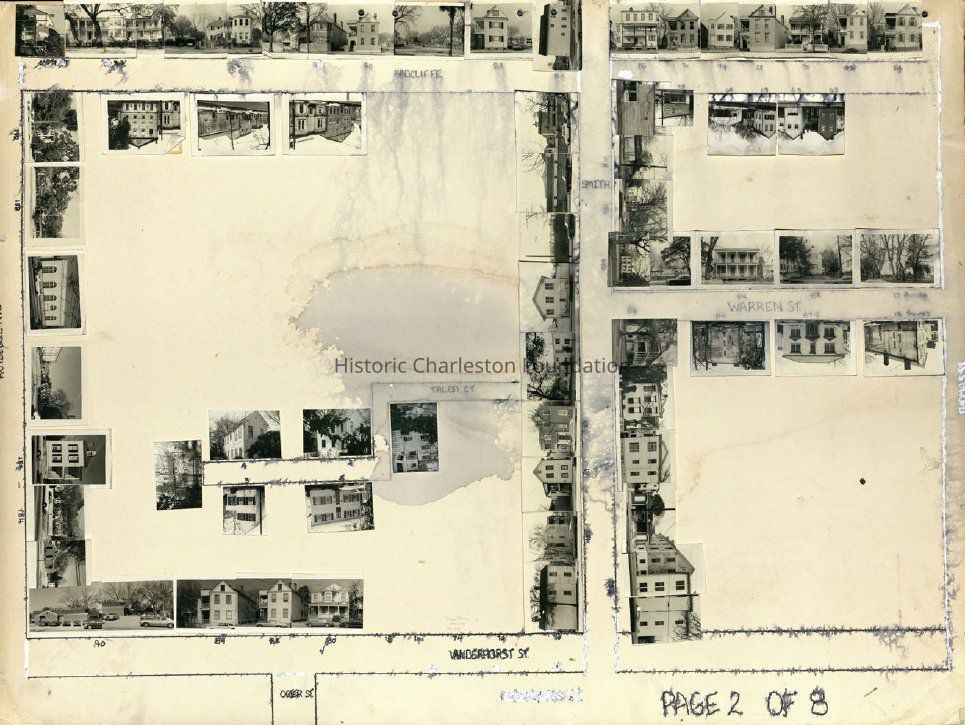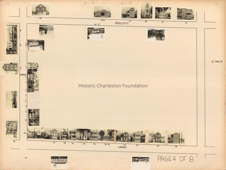 Board 4 (p. 2): Area bounded by Radcliffe Street, Smith Street, Vanderhorst Street, Rutledge Avenue, and Thomas Street. Intersected by Warren Street and Talon Court. Water-damaged; many addresses are illegible, but features photographs of 63 Radcliffe -- 65 Radcliffe -- 67 Radcliffe -- 69 Radcliffe -- 70 Radcliffe -- 72 Radcliffe -- 73 Radcliffe -- 74 Radcliffe -- 76 Radcliffe -- 78 Radcliffe -- 82 Radcliffe -- 90 Radcliffe -- 92 Radcliffe -- other Radcliffe Street buildings -- 134 Smith -- 140 Smith -- 146 Smith -- 148 Smith -- 80 Vanderhorst -- 82 Vanderhorst -- 84 Vanderhorst -- 90 Vanderhorst -- 154 Rutledge -- other Rutledge Avenue buildings -- 82 Warren -- 84 Warren -- 87 Warren -- 89 Warren -- 2 Talon Court -- 3 Talon Court -- 4 Talon Court -- 5 Talon Court.