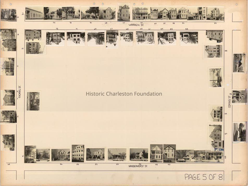 Board 7 (p. 5): Area bounded by Thomas Street, Warren Street, Coming Street, and Vanderhorst Street. Features photographs of 5 Thomas, 6 Thomas, 7 Thomas, 9 Thomas, 11 Thomas, 12 Thomas, 13 Thomas, 15 Thomas -- 53 Warren, 54 Warren, 55 Warren, 56 Warren, 58 Warren, 59 Warren, 60 Warren, 61 Warren, 62 Warren, 63 Warren, 64 Warren, 65 Warren, 66 Warren, 67 Warren, 68 Warren, 69 Warren, 70 Warren, 71 Warren, 72 Warren, 73 Warren, 74 Warren -- 125 Coming, 126 Coming, 125 Coming, 127 Coming, 125 Coming, 129 Coming, 135 Coming -- 42 Vanderhorst, 44 Vanderhorst, 46 Vanderhorst, 50 Vanderhorst, 52 Vanderhorst, 54 Vanderhorst, 56 Vanderhorst.