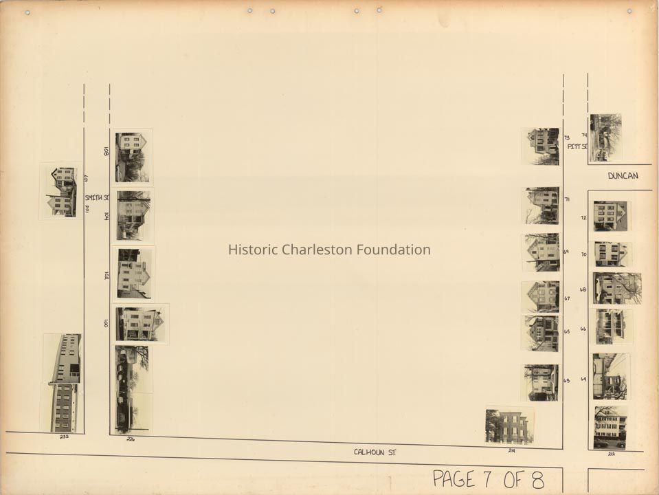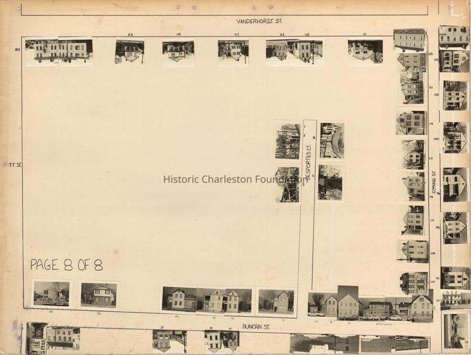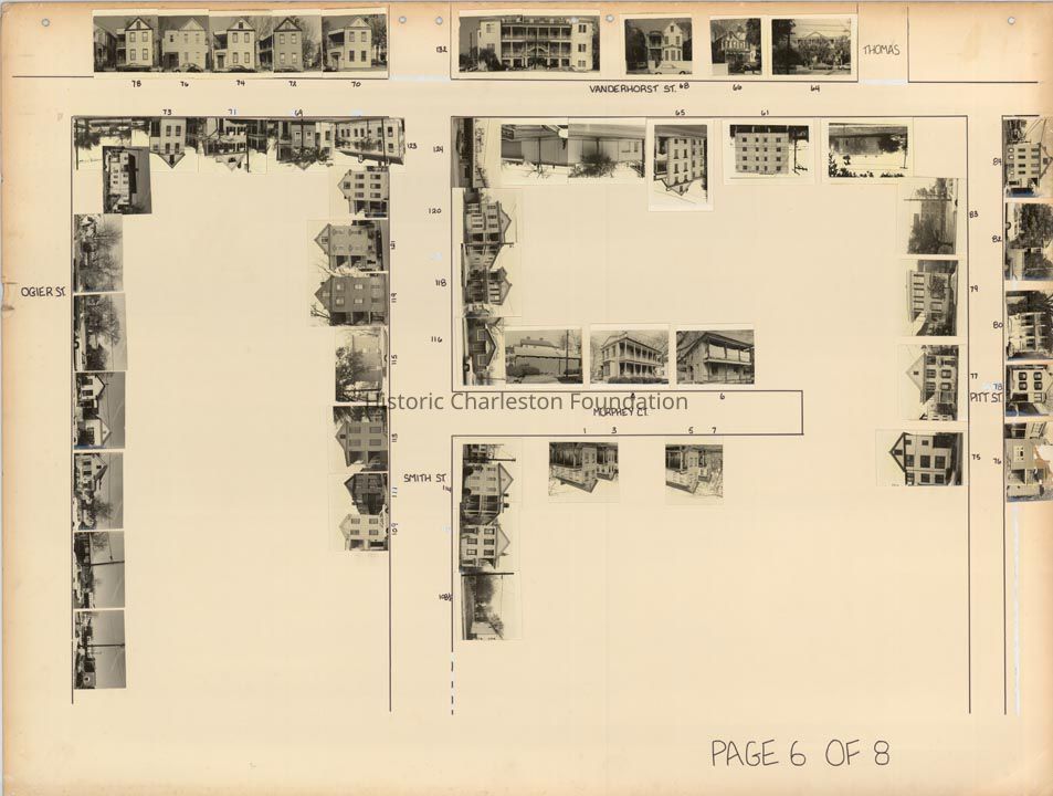 Board 8 (p. 6): Area bounded by Ogier Street, Vanderhorst Street, Pitt Street, [Calhoun Street], and bisected by Smith Street. Also shows Murphey Court. Features photographs of 61 Vanderhorst, 64 Vanderhorst, 65 Vanderhorst, 66 Vanderhorst, 68 Vanderhorst, 69 Vanderhorst, 70 Vanderhorst, 71 Vanderhorst, 72 Vanderhorst, 73 Vanderhorst, 74 Vanderhorst, 76 Vanderhorst, 78 Vanderhorst -- 75 Pitt, 76 Pitt, 77 Pitt, 78 Pitt, 79 Pitt, 80 Pitt, 82 Pitt, 83 Pitt, 84 Pitt -- 108 Smith, 109 Smith, 111 Smith, 113 Smith, 114 Smith, 115 Smith, 116 Smith, 118 Smith, 119 Smith, 120 Smith, 121 Smith, 123 Smith, 124 Smith, 132 Smith -- 1 Murphey, 3 Murphey, 4 Murphey, 5 Murphey, 6 Murphey, 7 Murphey. Also features photographs of several houses on Ogier Street; house numbers not indicated.