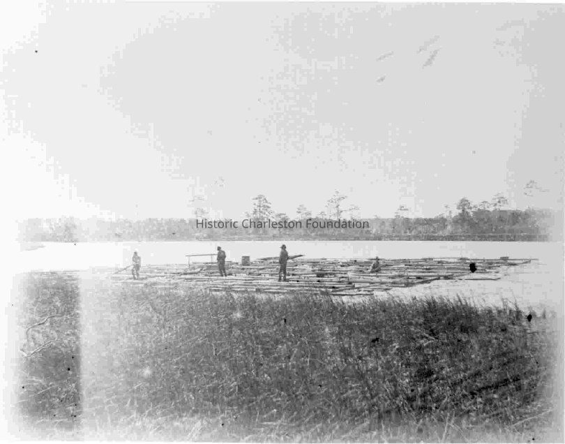 B&W photograph of four men rafting on Wappoo Cut, Wappoo Creek, St. Andrews.Collection