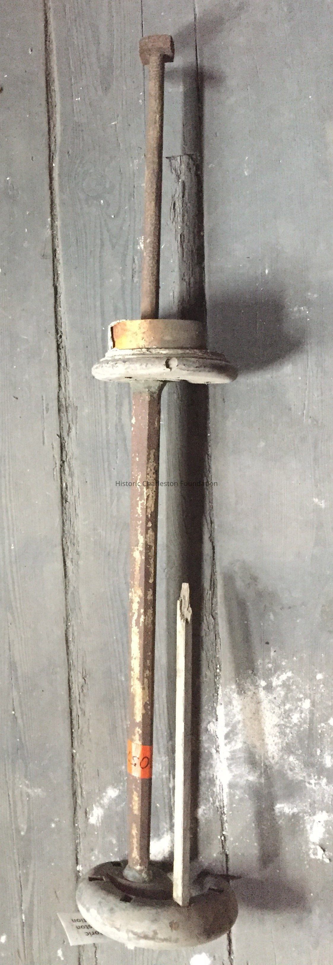 Portion of a railing that anchored into the landing of a staircase. Wooden railing piece still attached and metal center that goes to the floor. Railing piece in good condition; metal is rusty.