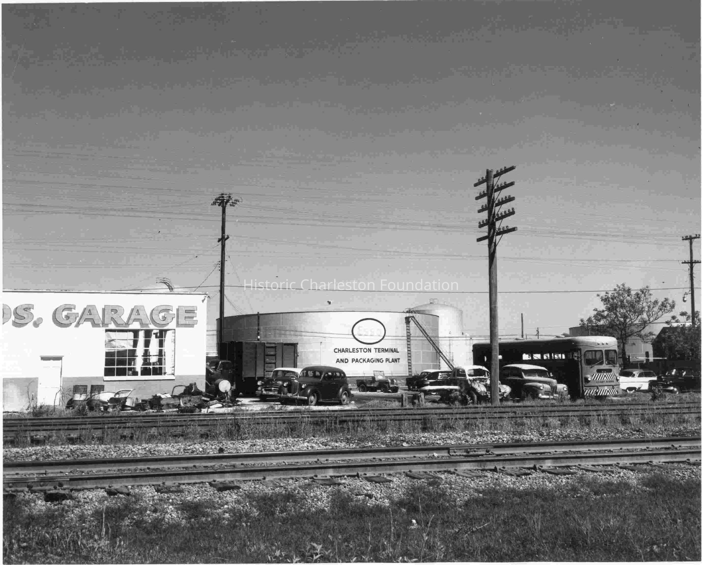 Railroad tracks in foreground. Esso Charleston Terminal and Packaging Plant and _______ [Br]os. Garage behind the tracks. Vehicles parked along the tracks, including a U.S. Navy bus.Collection