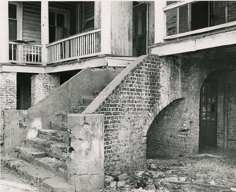 B&W photograph featuring the rear steps that led to the first-story piazza of the Blake-Grimke House (321 East Bay Street) before restoration by Historic Charleston Foundation.Collection