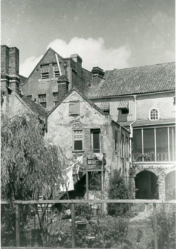 Photographic reprint of a 1930s photograph of the rear lot of 99-101 East Bay Street seen from Bedon's Alley, showing the rear (west) elevation of 99-101 East Bay and the outbuilding.