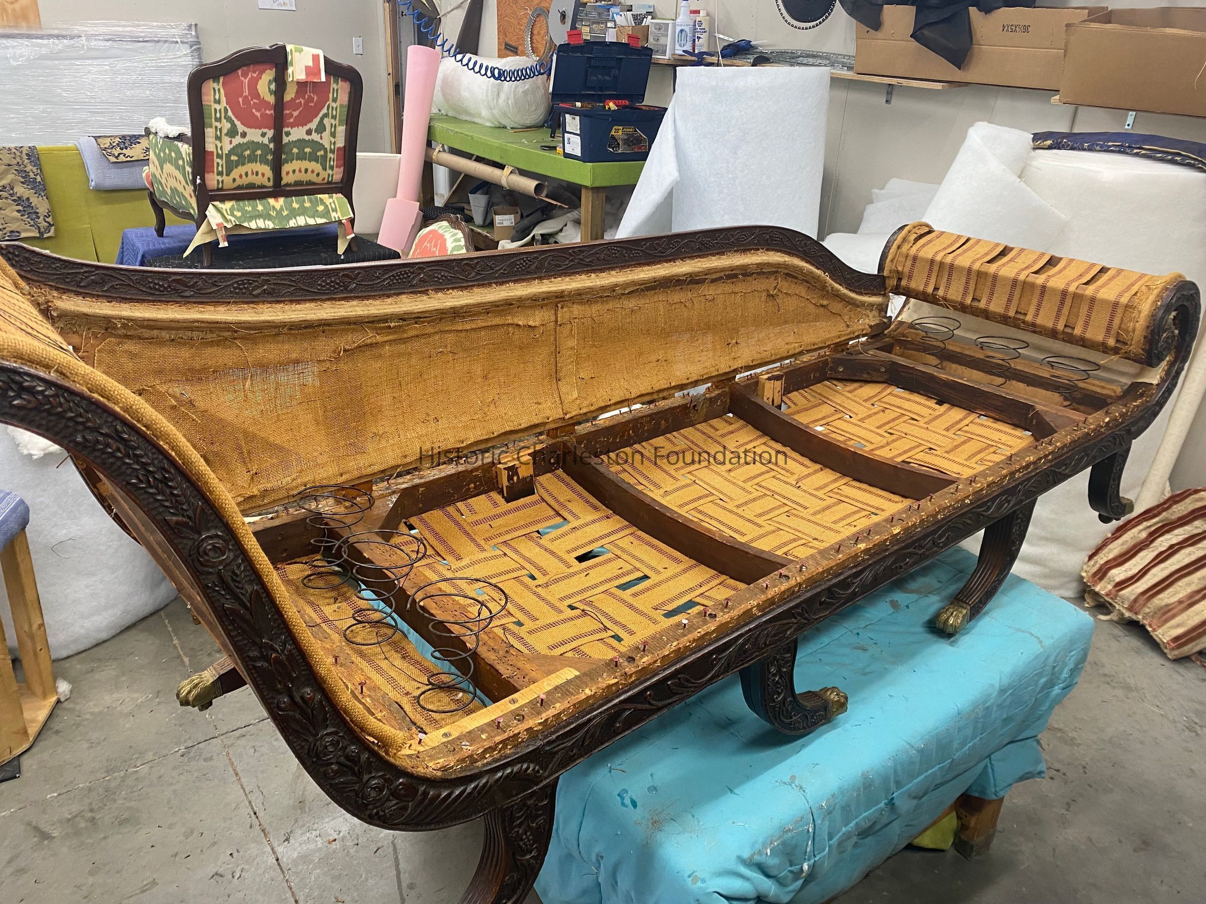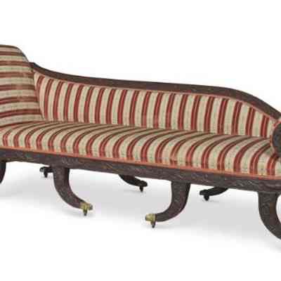 This sofa survives as one of only four extant examples of its form with carving attributed to the McIntire shop tradition. One at Winterthur Museum is illustrated by Dean T. Lahikainen in Samuel McIntire: Carving an American Style (Peabody Essex Museum, 2007, figure 4-140 on p. 162). One is in the collection of Historic Deerfield (92.14) and illustrated in The Magazine Antiques (December 1930): fig. 10, p. 502. Another in the collection of the Henry Ford Museum (70.85.1) was formerly owned by Israel Sack, Inc. and illustrated in American Antiques from Israel Sack Collection, Volume II, no. 1053, p. 417.