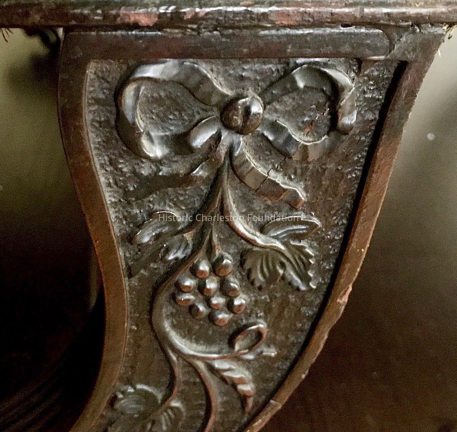 The exceptional carving stems from the acclaimed shop tradition established by Samuel McIntire (1757-1811), the Salem architect who was responsible for the designs of a number of the finest Federal houses in Salem as well as their architectural carving and furniture. The motifs displayed on this sofa – including the bowknot, bunches of grapes and star-punched ground -- are hallmarks of his work. Closely related clusters of grapes and grape leaves descending from a bowknot are found on seating furniture attributed to McIntire, including a set of shield-back sidechairs and a sofa in the Karolik Collection at the Museum of Fine Arts, Boston originally owned by Elias Hasket Derby and a set of oval-back chairs owned by his daughter, Elizabeth Derby West.2 These motifs also appear on a set of seating furniture represented by two matching sofas and four window stools made for the parlor of the Peirce-Nichols House in Salem, which was remodeled by Samuel McIntire in 1801 at the time of the marriage of Jerathmiel Peirce’s daughter to George Nichols.
