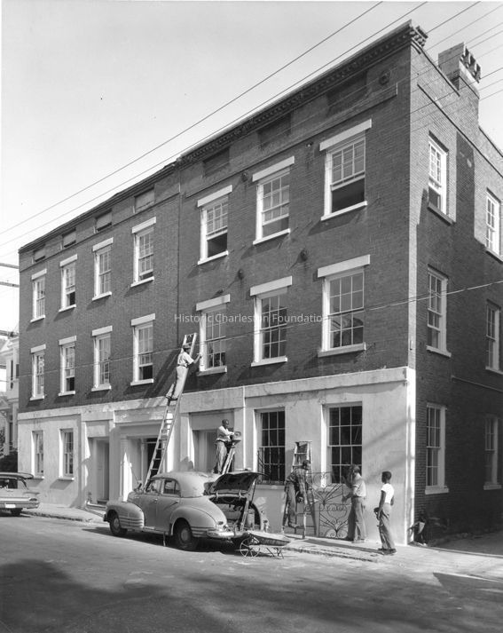 Street (front) elevation, corner view of building during its rehabilitation. Shows workmen (both black and white) working on repairs to the building, handling ironwork, on ladders, with car parked in front of building with trunk open for access to tools, wheelbarrow next to car.