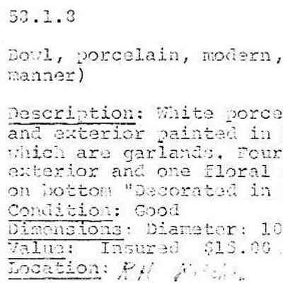 White with upper rim and interior decoration painted in black with narrow band below which are garlands. Four floral sprigs in black on the exterior and one floral sprig in the center interior.Location