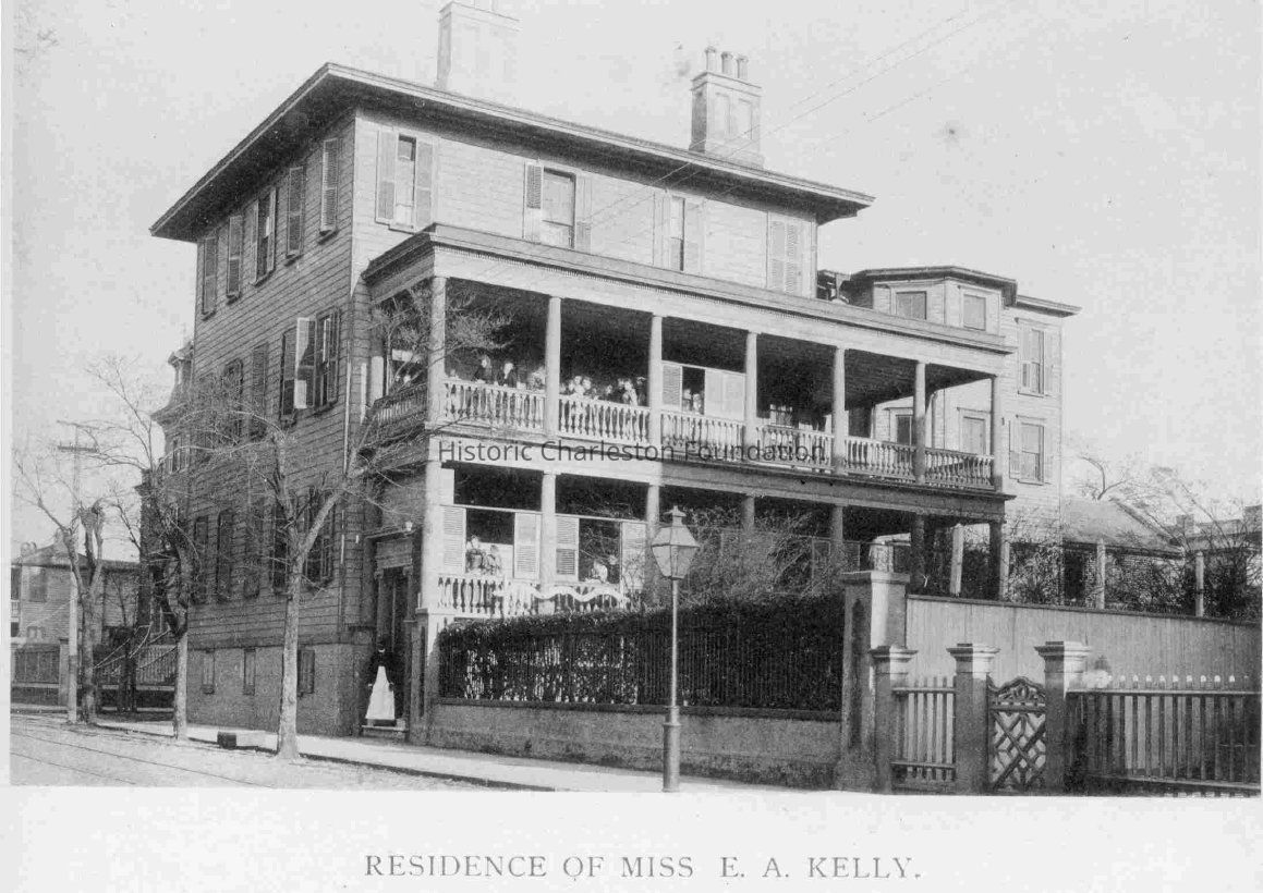 Photograph of the residence of Miss E.A. Kelly, which housed the Charleston Female Seminary, located at 151 Wentworth Street. Street elevation, corner view of the house showing the piazzas on which several women (presumably students and teachers) are standing.Context