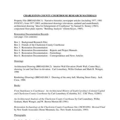 "Charleston County Courthouse Historic Structures Report on the Architectural Development and Historical Alterations to the Building" by (Milner, 1991). (PDF on ExternalHardDrive MyPassport1.)Container