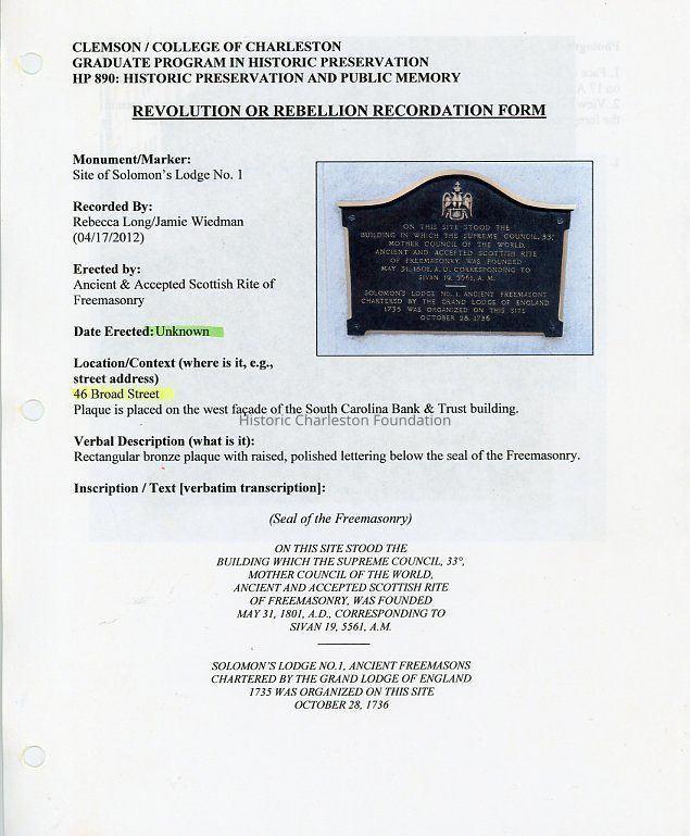Survey of memorial plaques and markers in Charleston by graduate students in the Clemson/CofC Graduate Program in Historic Preservation enrolled in the Historic Preservation and Public Memory course. Recordation includes name, "erected by," date erected, location/context, description, and a transcription of the text. also includes photographs.