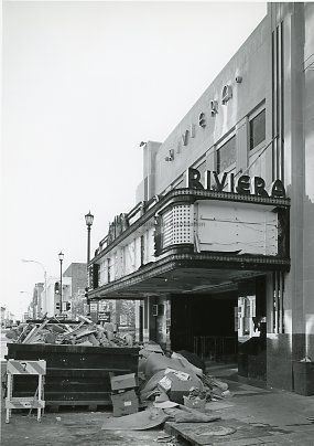 B&W photograph of the Riviera Theater (227 King Street) showing the damage done by Hurricane Hugo. Dated November 1989.