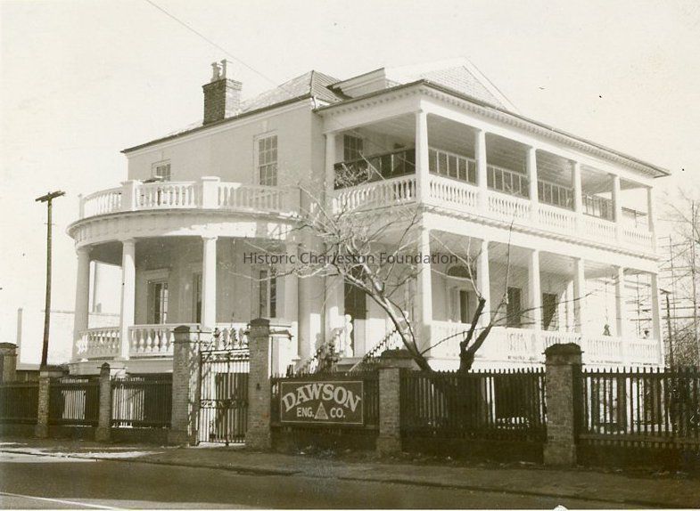 B&W photograph of the Robert Primerose House (332 East Bay Street) after rehabilitation. Shows the southwest corner of the building (front and piazzas) and picket fence. Dawson Eng[ineering] Co. sign posted on the fence by the entrance gate.