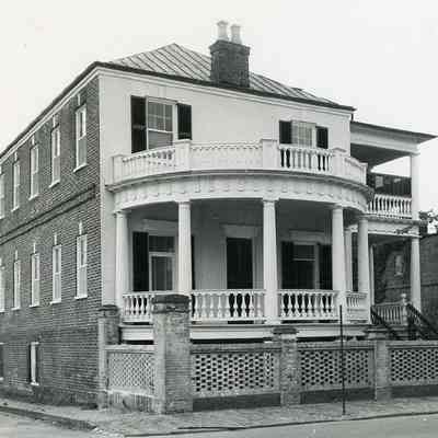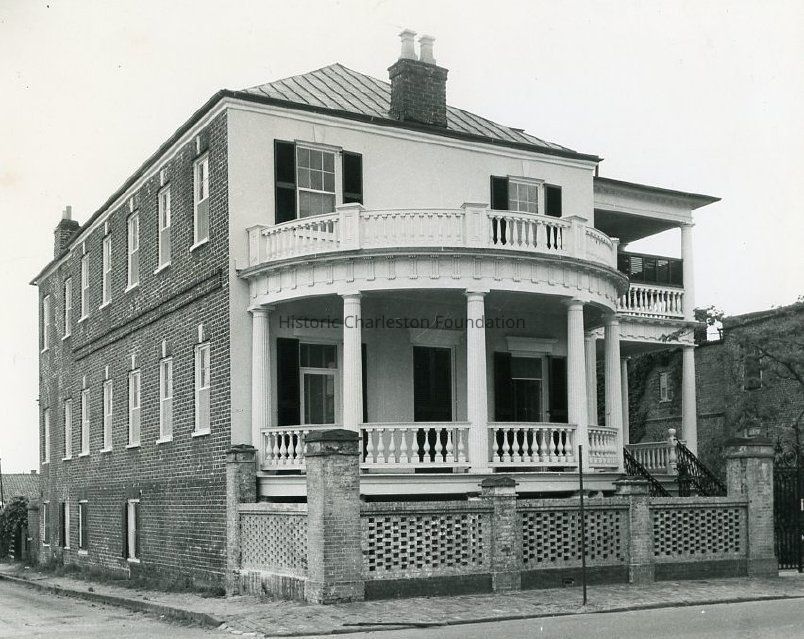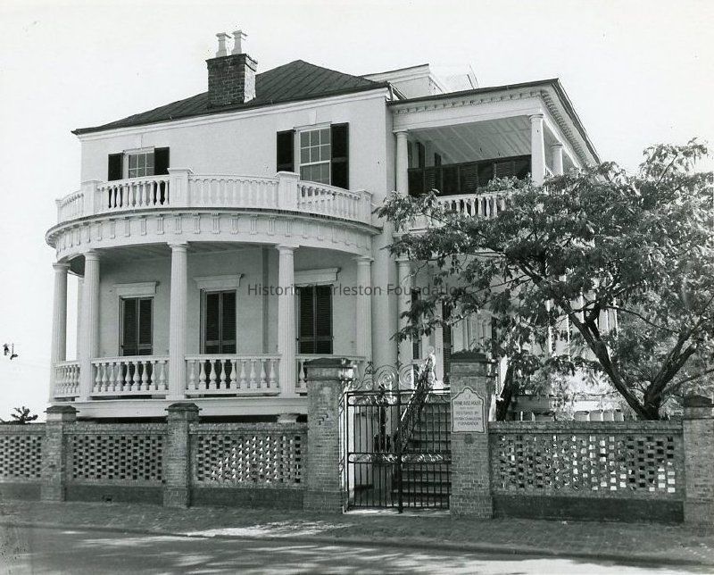 a: West (front) elevation showing the portico, and the brick fence and wrought iron gate in front of the house. Sign posted to gate post "Primerose House...Restored by Historic Charleston Foundation."