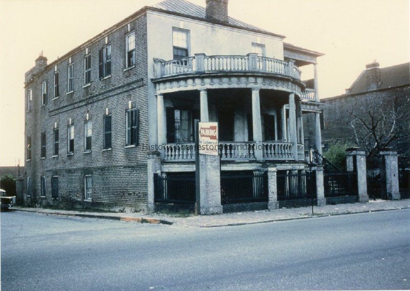 a: Before rehabilitation by Historic Charleston Foundation, then the location of the Sam Solomon Company. Shows the west (front) elevation and north elevation, and the street corner (East Bay and Vernon). Signage for parking for the Sam Solomon Company posted at the northwest corner of the picket fence. Car parked on the side of the street in front of the building.