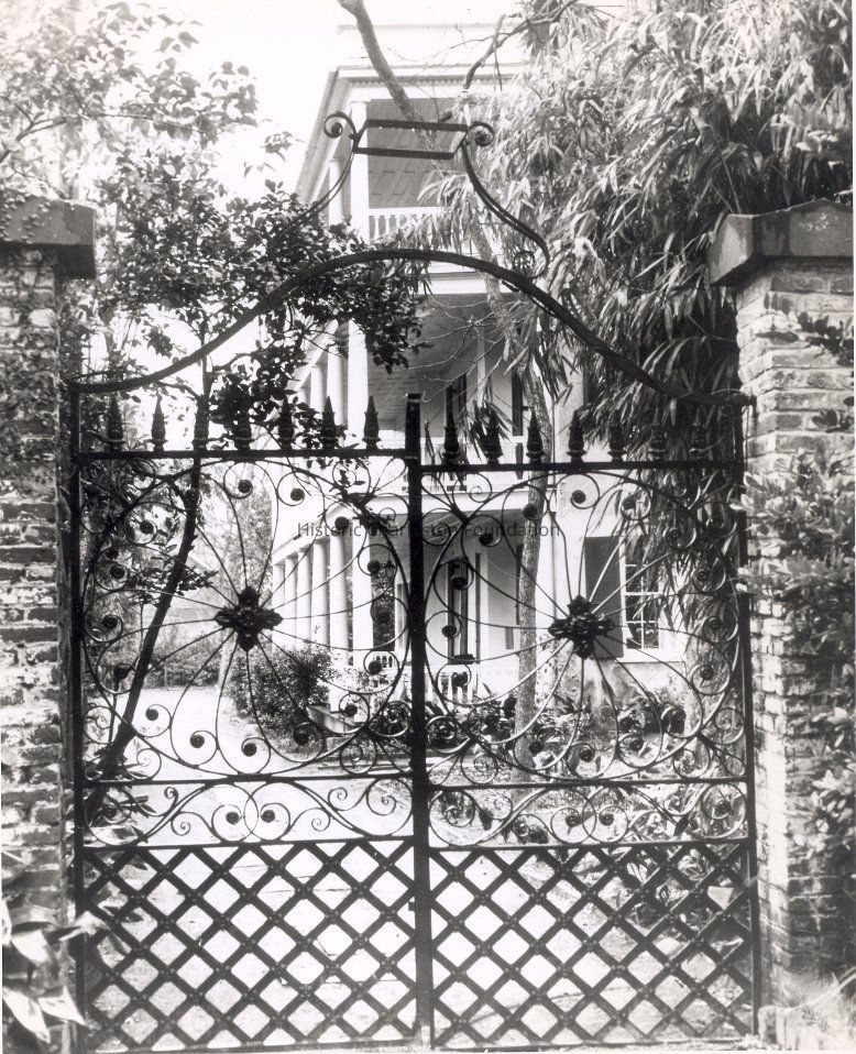B&W photograph of the Robert T. Chisolm House (23 Legare Street) viewed through the wrought iron gate. Captioned on back: "The handsome wrought iron gate by which you enter this dwelling on the Legare Street Tour dates from 1817. The house like a number of others in Charleston is haunted by a ghost."