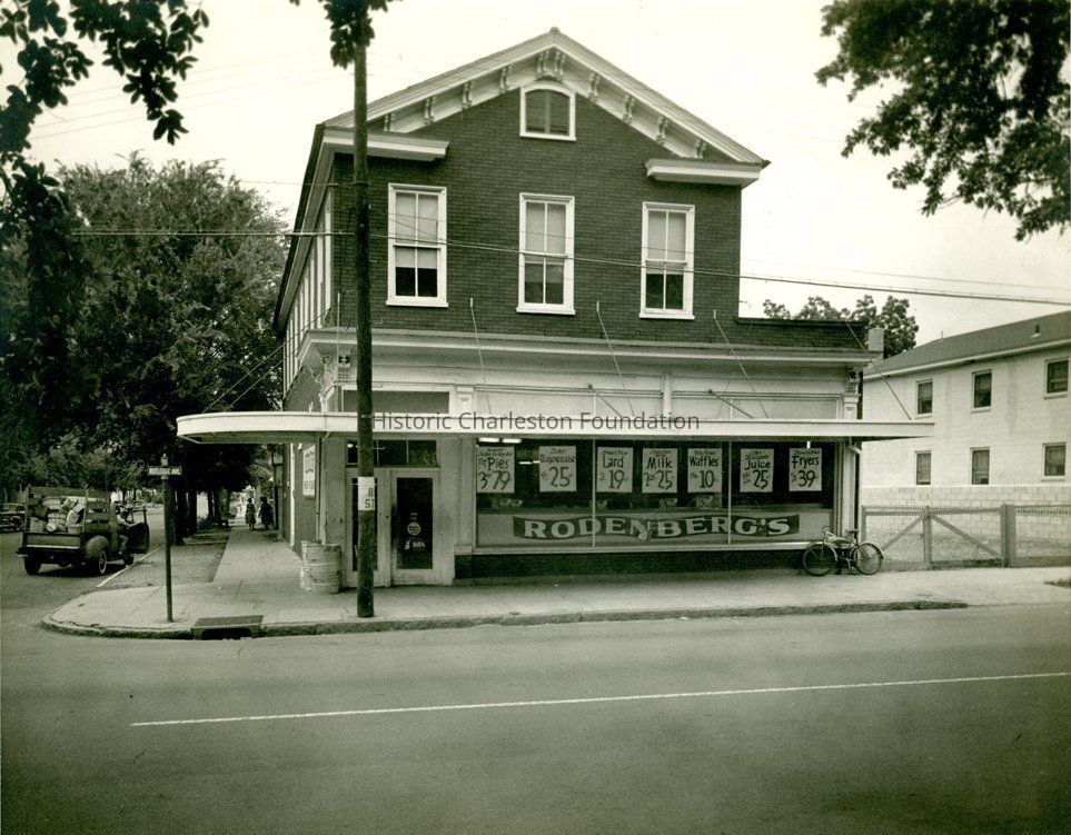 B&W photograph of Rodenberg's [grocery store], street (front) elevation, located at 569 Rutledge Avenue. View of the street corner -- the northwest corner of Rutledge Avenue and Sumter Street. Signage for pies, mayonnaise, lard, milk, waffles, juice, and fryers posted in the window. Also features a bicycle parked against the right side of the building; a pickup truck carrying baskets of produce parked on Sumter Street; and two women walking on the sidewalk.Context