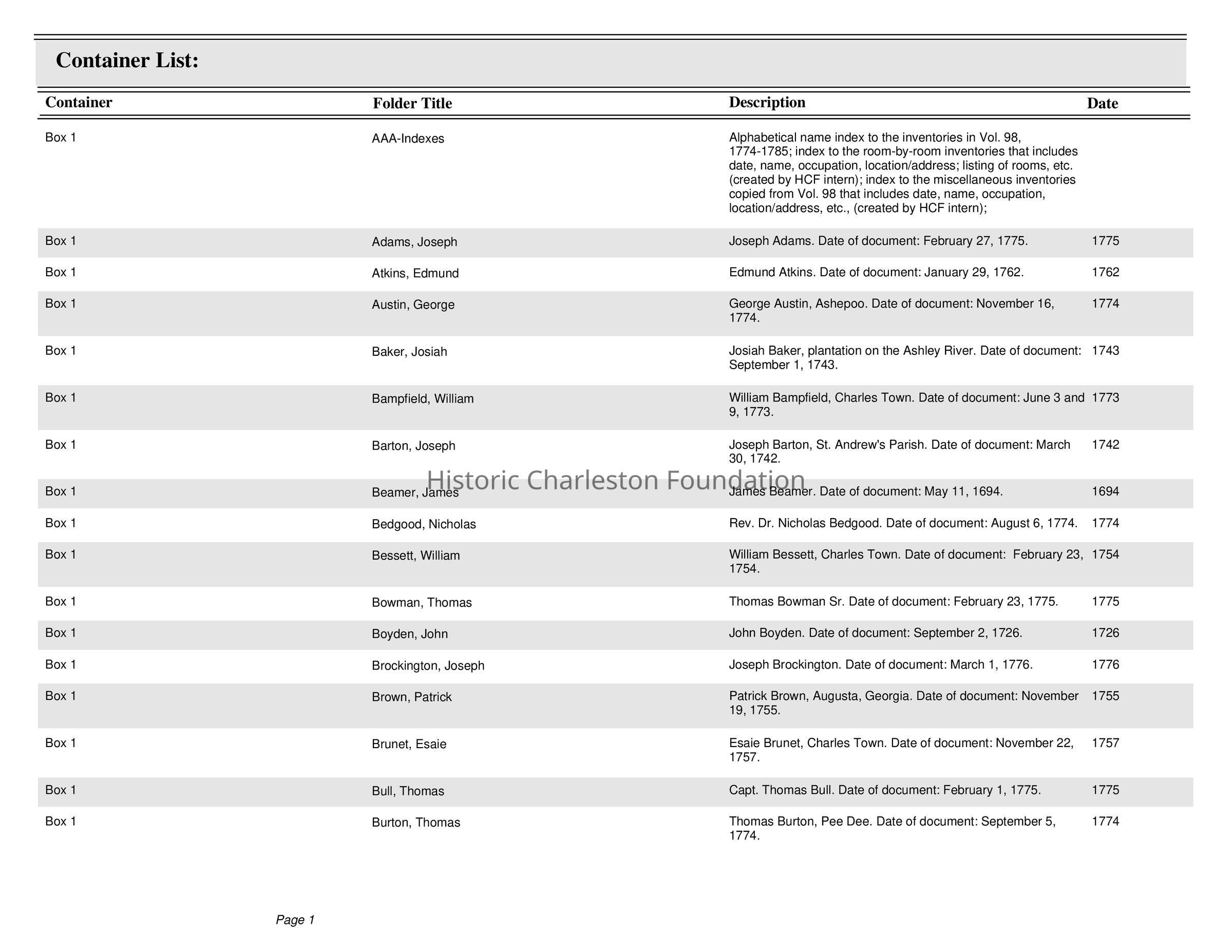 Alphabetical name index to the inventories in Vol. 98, 1774-1785; index to the room-by-room inventories that includes date, name, occupation, location/address; listing of rooms, etc. (created by HCF intern); index to the miscellaneous inventories copied from Vol. 98 that includes date, name, occupation, location/address, etc., (created by HCF intern);Container