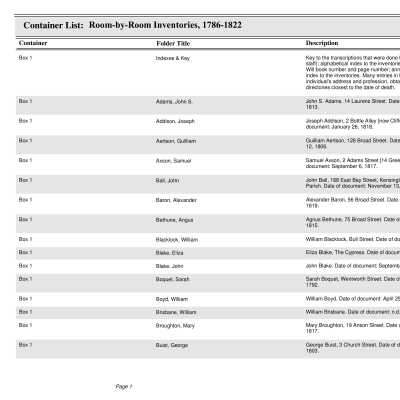 Key to the transcriptions that were done by Carrie Albee (HCF staff); alphabetical index to the inventories on file, including the Will book number and page number; annotated chronological index to the inventories. Many entries in both indexes include the individual's address and profession, obtained from city directories closest to the date of death.Creator