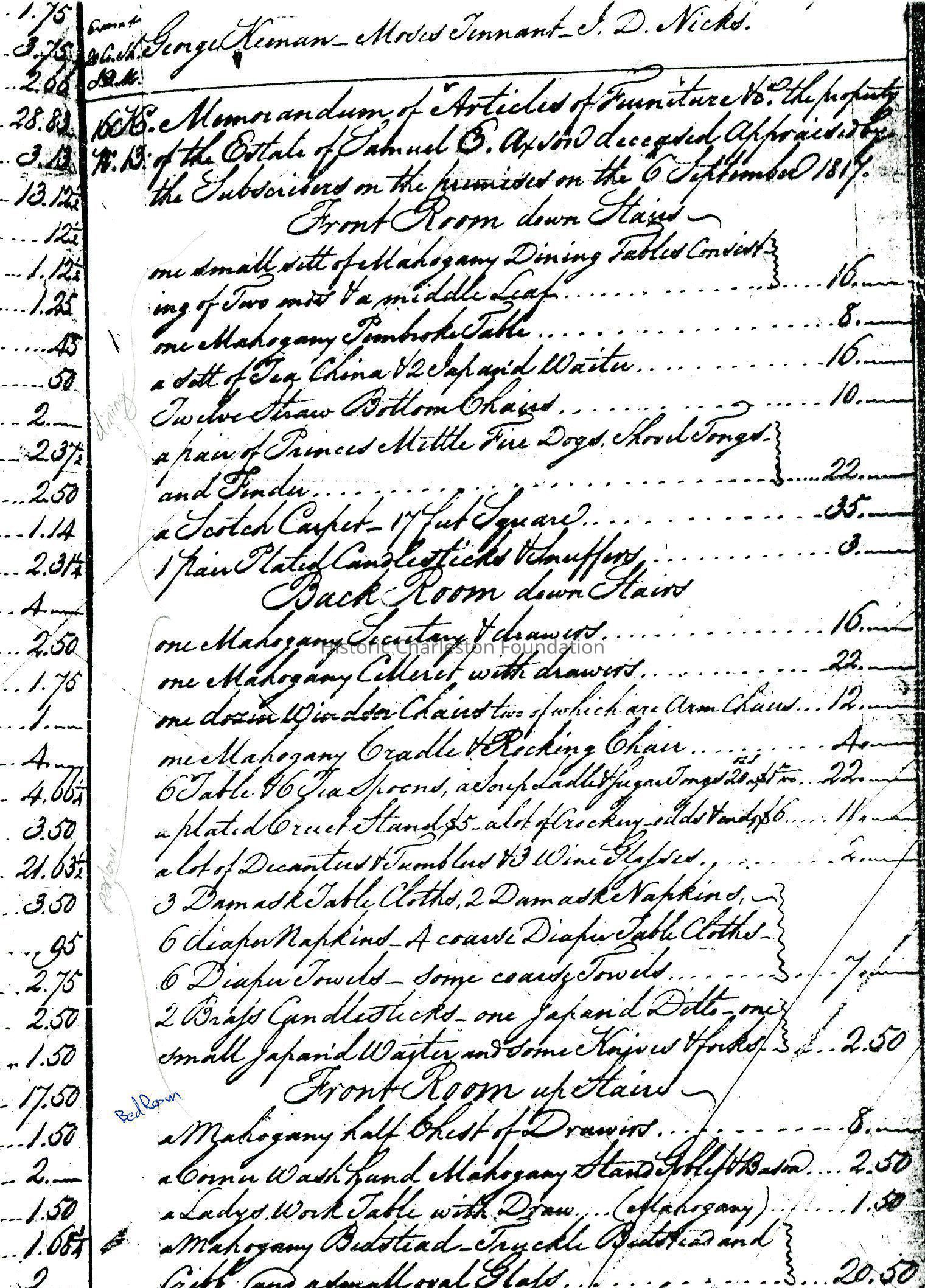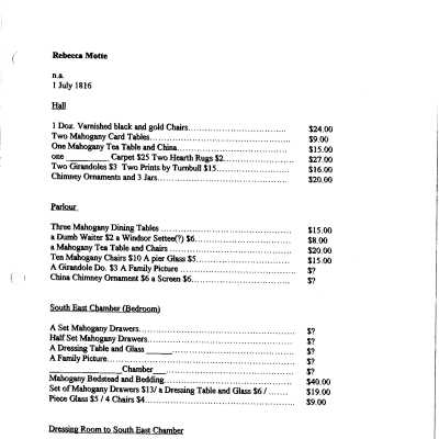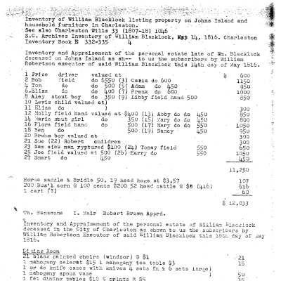 Lucretia Radcliffe, corner George and Meeting Streets. Date of document: December 5, 1821. Also contains a room-by-room inventory of her at St. Bartholomew Parish plantation.Date(s) of Creation