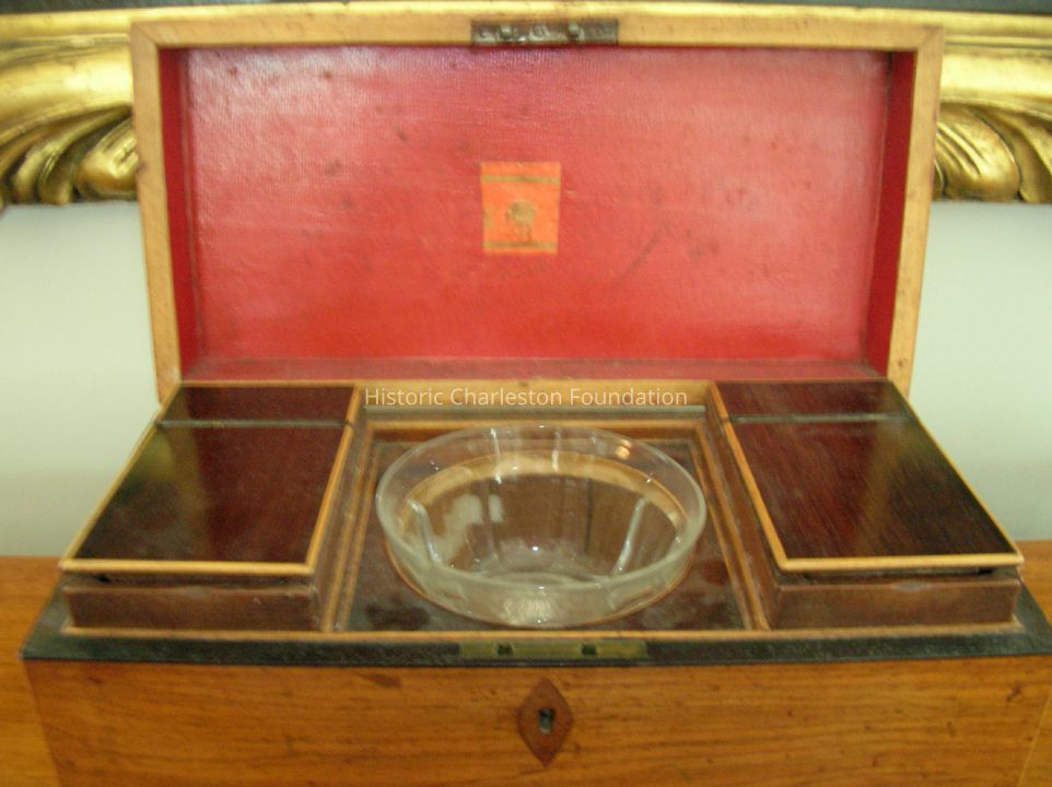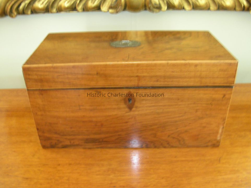 Rectangular Rosewood Tea Caddy with Light Wood Inlaid Corners. Inlaid Keyhole Surround. Copper Escutcheon with Molded Acorn Leaves. Interior with Glass Bowl Flanked By Hinged Paper Lined Compartment.Collection