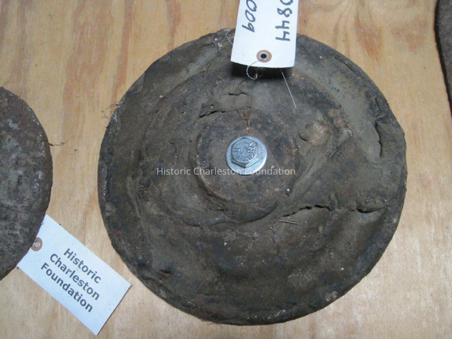 One of two round, geometric patterned circles for capping earthquake bolts.Collection