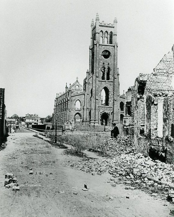 Reprint of a B&W photograph of the ruins of the Cathedral of St. John and St. Finbar the Baptist and a portion of Legare Street, destroyed in the fire of 1861.
