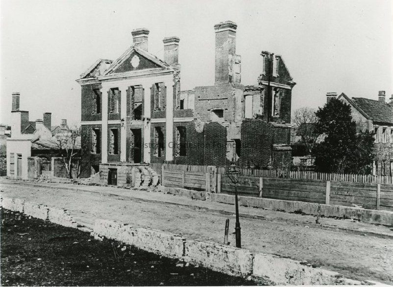 Reprint of a photograph of the ruins of the Pinckney Mansion. Wood fence runs across the front of the property.
