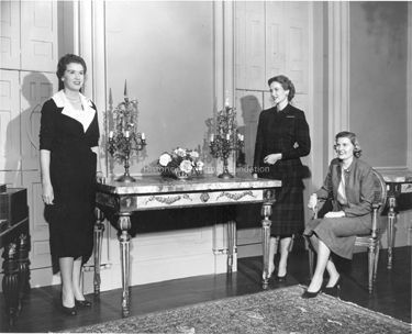 B&W photograph of three Russell House hostesses, ca. 1956, Miss Vereen Huguenin (Vereen Coen), Mrs. Rufus Barkley (Nella Barkley), and Mrs. Huger Sinkler.Collection