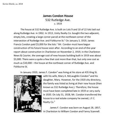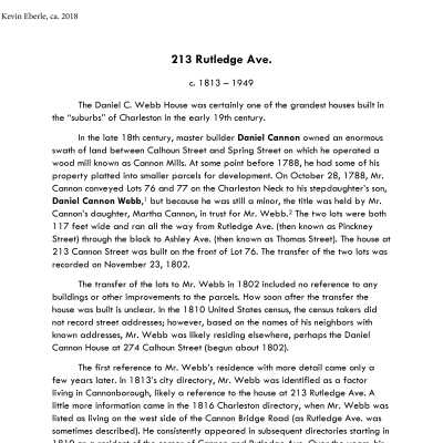 File contains FOHG house history for 15 Rutledge (2006); FOHG house history for 16 Rutledge (2006); historical research reports for 210 Rutledge, 213 Rutledge, 532 Rutledge, 533 Rutledge, 698 Rutledge, and the Kiawah Homes housing complex (Eberle, 2018).Collection