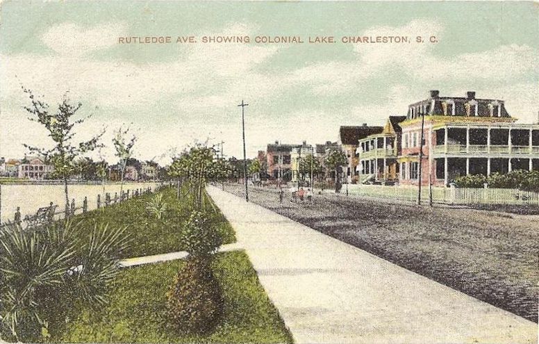Postcard (scan) featuring the view looking north on Rutledge Avenue at Colonial Lake. Shows row of houses starting at 32 Rutledge Avenue. Pedestrians in the street.Collection