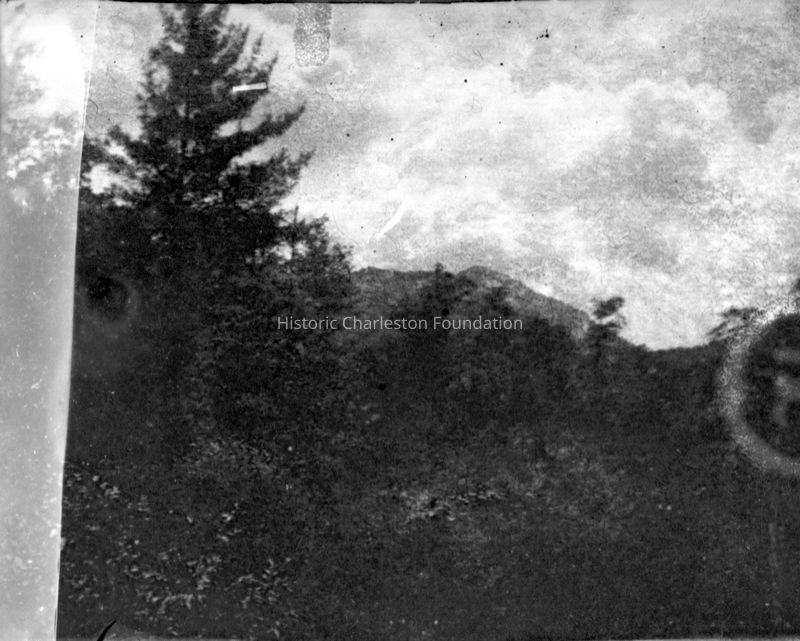 Sixteen B&W photographs (scans of negatives) of mountain scenes (possibly Table Rock, SC, area), rural and dirt roads, child, log cabin, lake shore, dog, horses, mule-drawn cart, and a woman in horseback riding clothes(?).