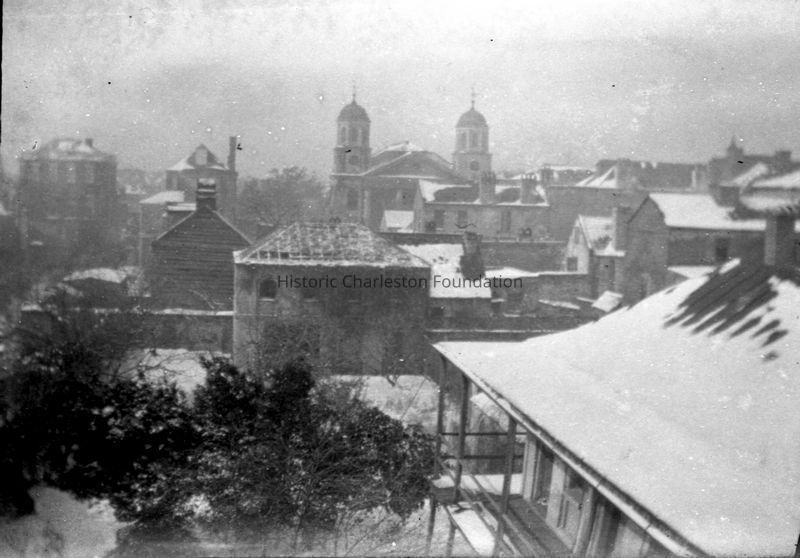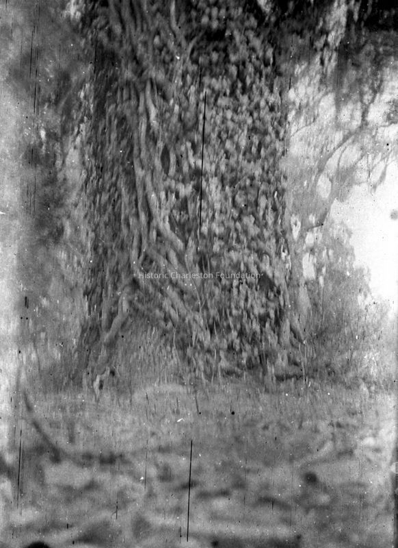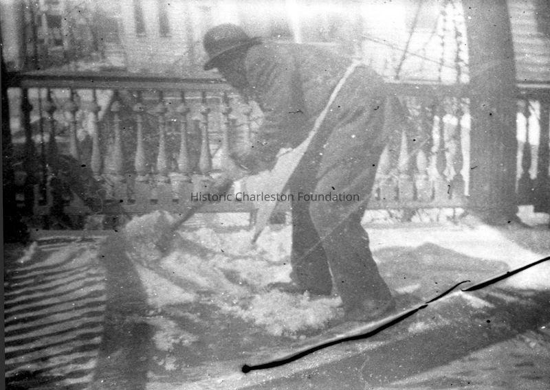 Eighteen B&W photographs (scans of negatives) of oak allee, dog, kudzu covering a tree, the bend on Church Street(?), a plantation house, ivy-covered porch columns, peacocks, Charleston rooftops covered in snow (Nathaniel Russell House and First Scots Presbyterian Church in background), man shoveling snow on a porch, rice cultivation.