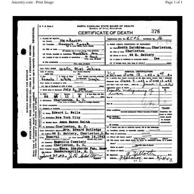 Notes: Sabina E. Wells was born in Charleston on July 5, 1876, and died on June 13, 1943, in Hoopers Creek, Henderson, NC. She was the daughter of Edward Laight Wells & Anna Elizabeth Mason Smith, and lived at 44 South Battery. (Ancestry.com, accessed 5/9/2012.)Created By