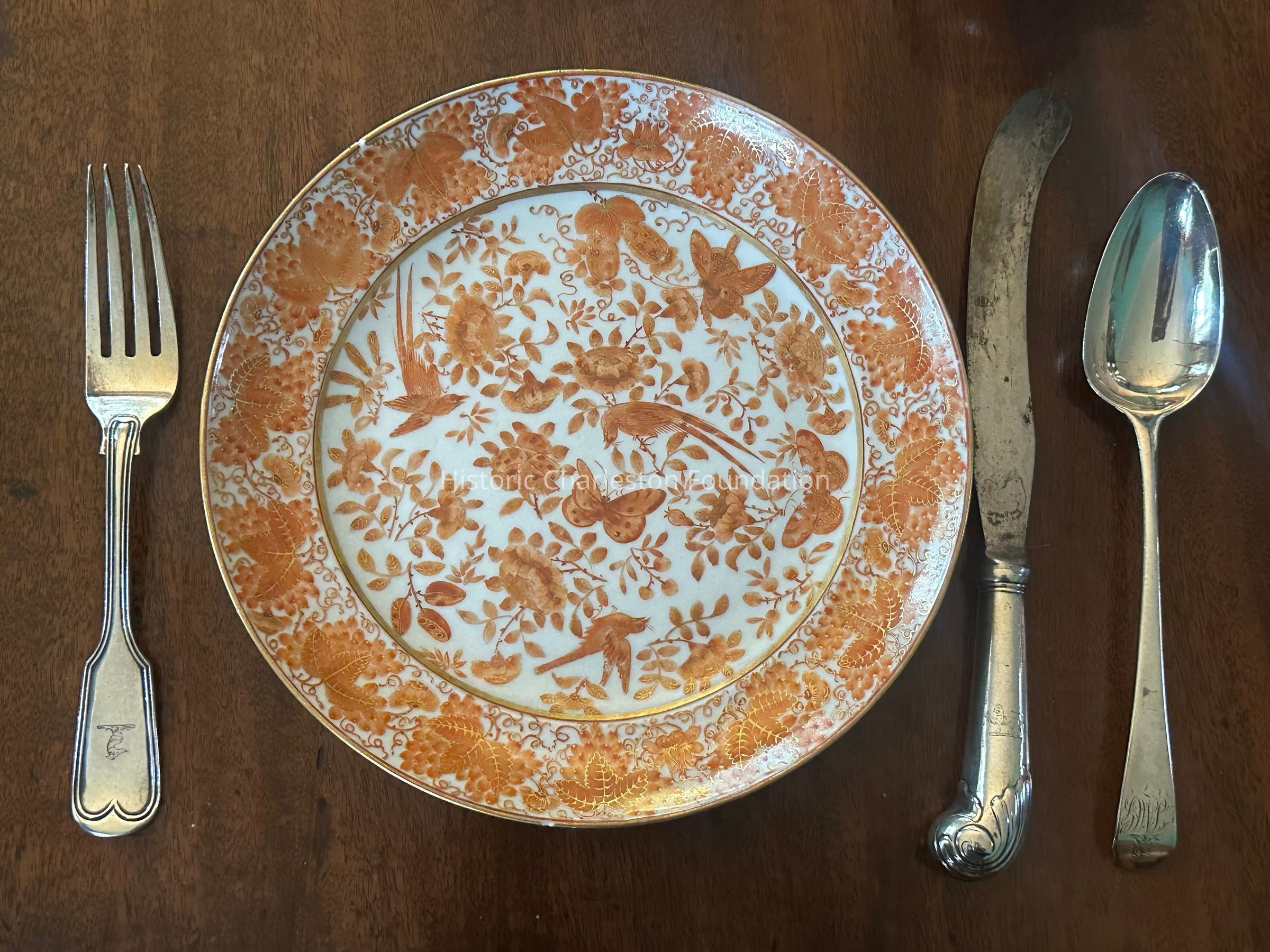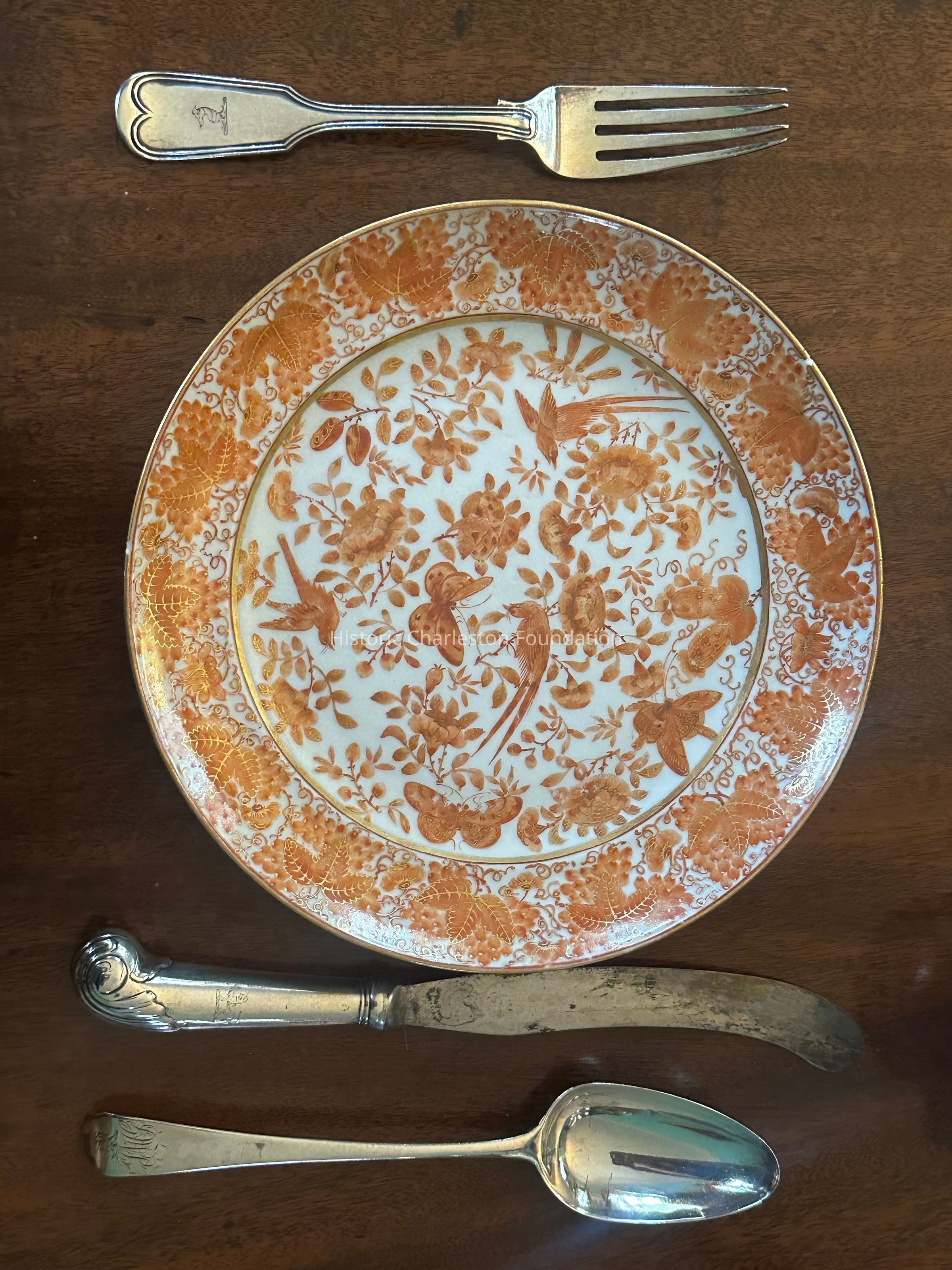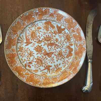 Chinese Export Porcelain in Sacred Bird & Butterfly Pattern, C.1815, Dinner Plate , One of a large set of Chinese Export Porcelain in Sacred Butterfly Pattern with Underglaze Orange and Overglaze Gilt Decoration in a Lush Pattern of Birds, Butterflies, and Flowers. Gilt Rim. Original Loan of 54 Pieces, but 23 Pieces Subsequently Returned. One of six plates.Collection