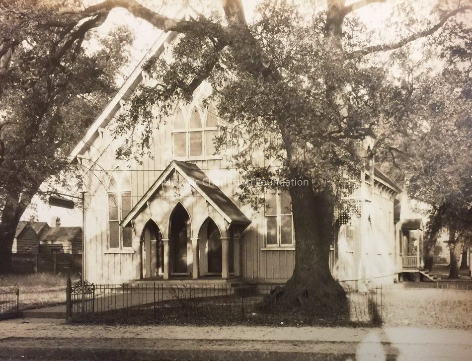 B&W photograph (scan) of Salem Baptist Church (570 Rutledge Avenue), street (front) elevation, before being replaced in 1930 by another church building. Located at the northeast corner of Rutledge Avenue and Sumter Street.