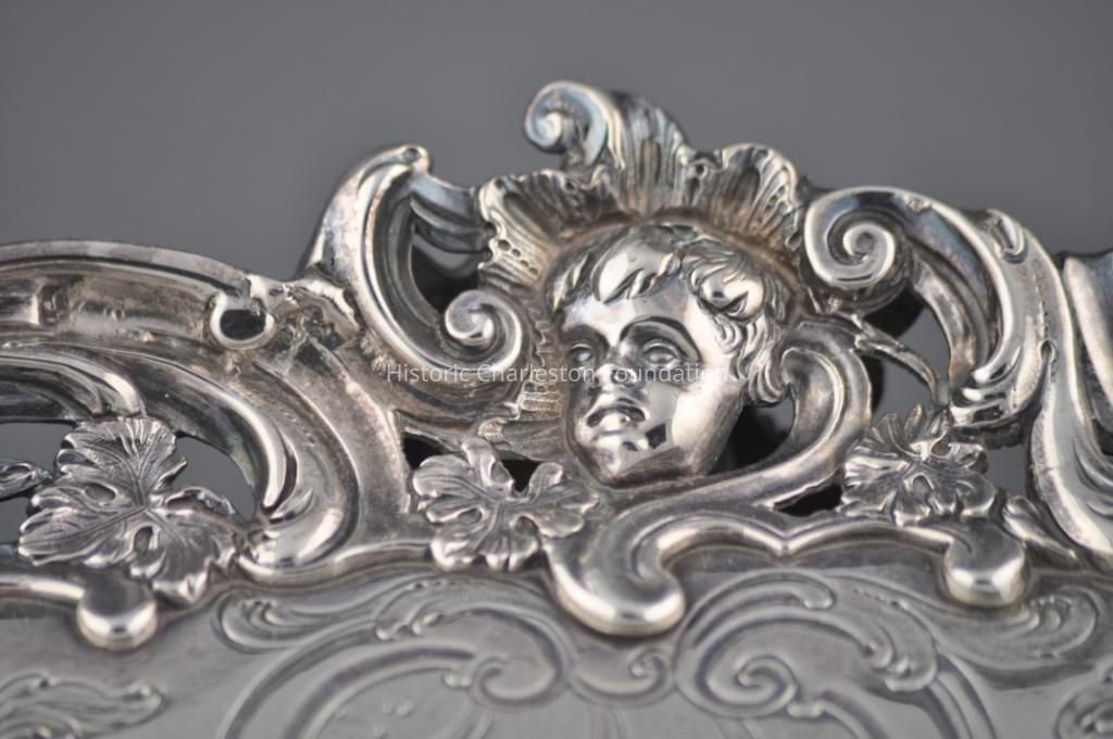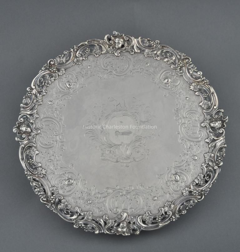 Engraved with the crest of Lieutenant Governor William Bull II (1710-1791) of Charleston, this high-rococo-style salver was made in the London workshop of the notable Huguenot silversmith Samuel Courtauld. One of two pieces of silver in Historic Charleston Foundation's collection that descended in the Bull family, it exemplifies the fashionable plate imported from England for the Charleston's sophisticated clientele.