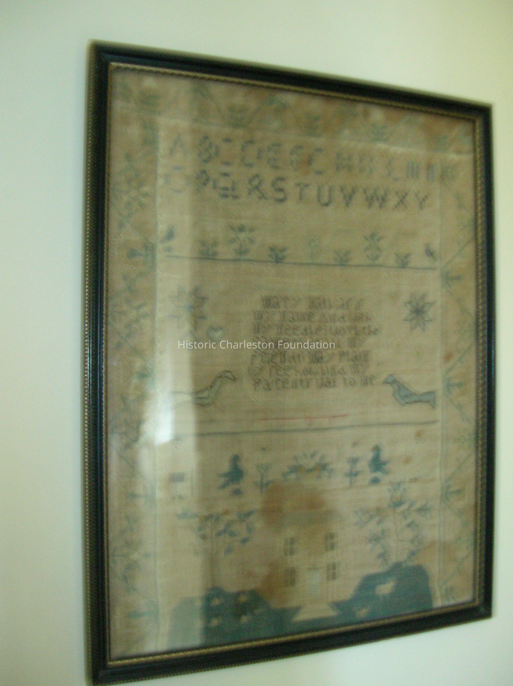 Sampler on linen signed Mary Mathias and dated 1804. Floral border, scene of house, trees, birds, and a man and woman across bottom. Large case alphabet at top in blue cross stitch (A-Y) under which lower case alphabet is cross stitched in white. Verse in center. Framed in narrow black frame with gilt inner and outer beaded edge.Collection