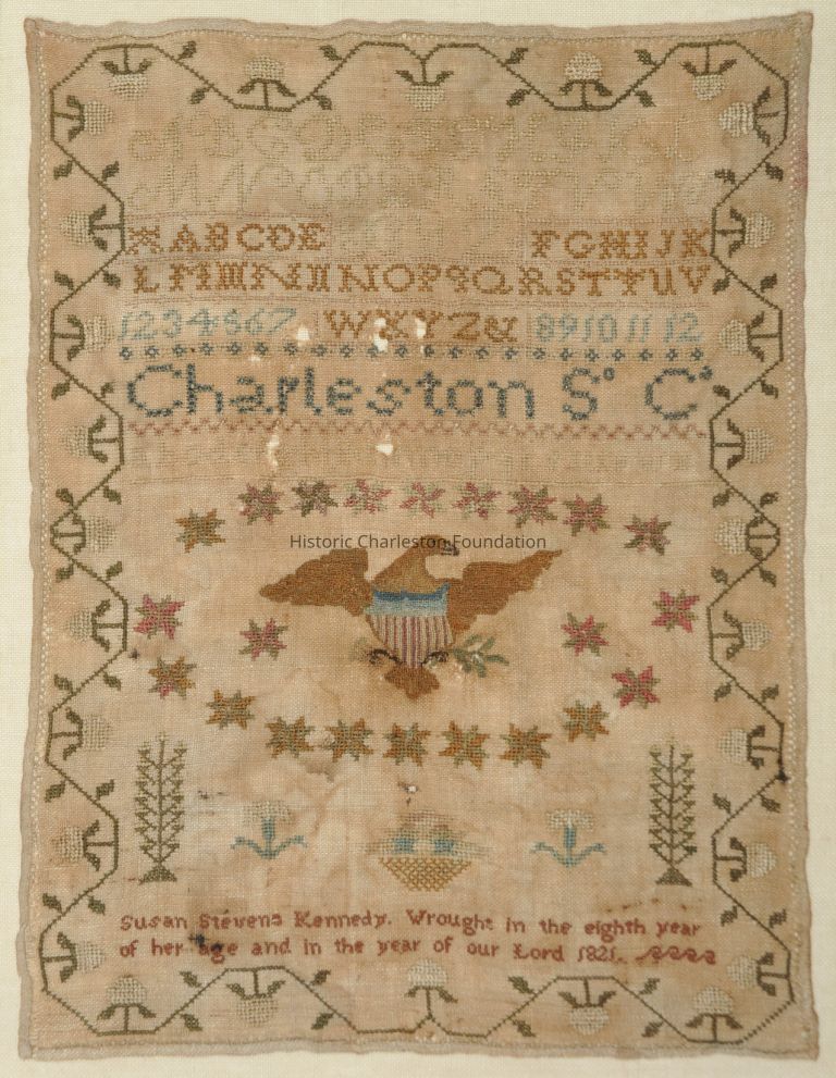 The acquisition of embroidery skills under the guidance of a schoolmistress or tutoress had been an important accomplishment for Charleston's daughters for over a century when Susannah Stevens Kennedy completed her bold cross-stitched sampler. Dated 1821, the silk-on-linen needlework includes the headline "Charleston SC" and a stitched note stating that "Susan" finished the project "in the eighth year of her age."