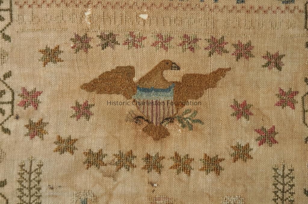 Worked By Susan Stevens Kennedy At the Age of Eight in Charleston in 1821. It Is Worked Primarily in Green, Blue, Pink and Gold Silk Thread on Linen with Alphabets in Cross Stitch. in the Center Is an American Eagle Motif with a Red, White and Blue Shield in Petit Point. the Eagle Is Surrounded By Twenty Two Stars. the Entire Sampler Is Surrounded By a "Rose Bud" Border, the Linen Measuring 16 1/2" By 12 1/2".