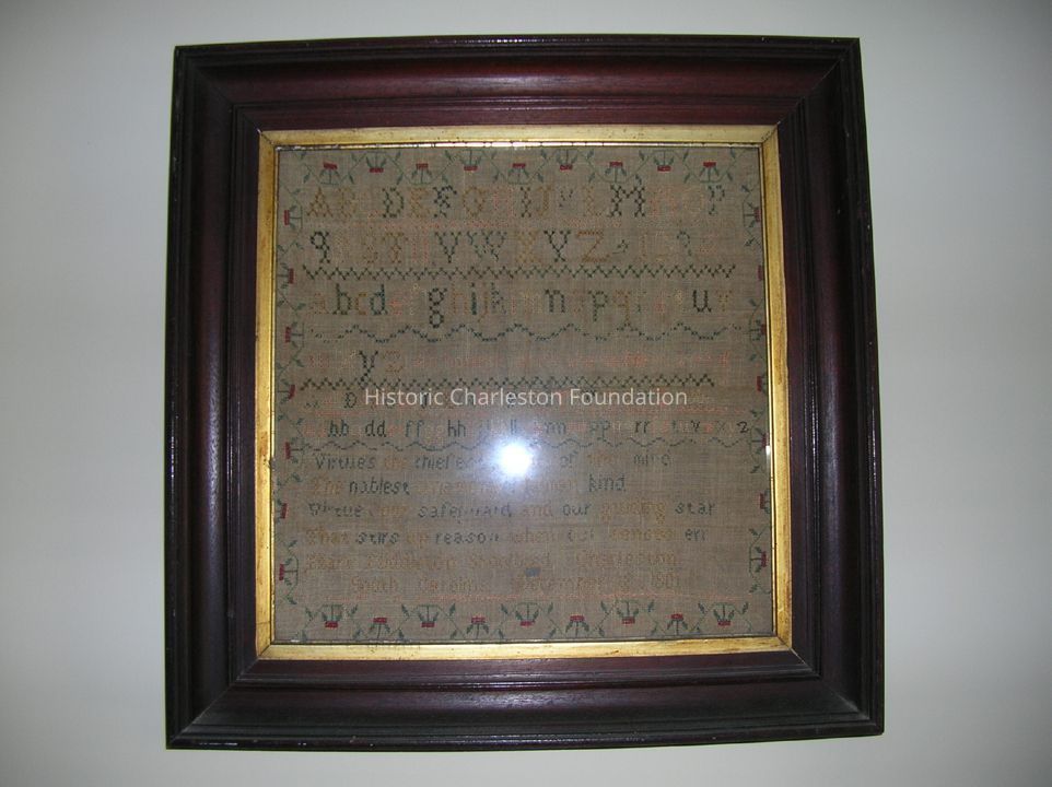 Linen Needlework Sampler, C.1801, By Mary Middleton Shoolbred of Charleston. Reads "Virtues the Chiefest Beauty of the Mind/the Noblest Adornment of Humankind/ Virtue Our Safeguard and Guiding Star/ That Stirs Up Reason When Our Senses Err."Collection