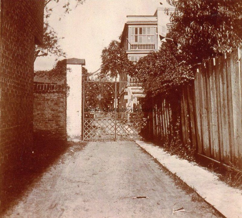 a: Reprint of photograph showing the view looking down Sass Alley through the gate with the house in the background. (Identifed as a South Carolina Historical Society phogotraph.)