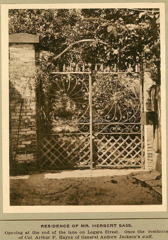 b: Photograph of the gate. Mounted on paper captioned "Residence of Mr. Herbert Sass. Opening at the end of the lane on Legare Street. Once the residence of Col. Arthur P. Hayne of General Andrew Jackson's staff."Collection