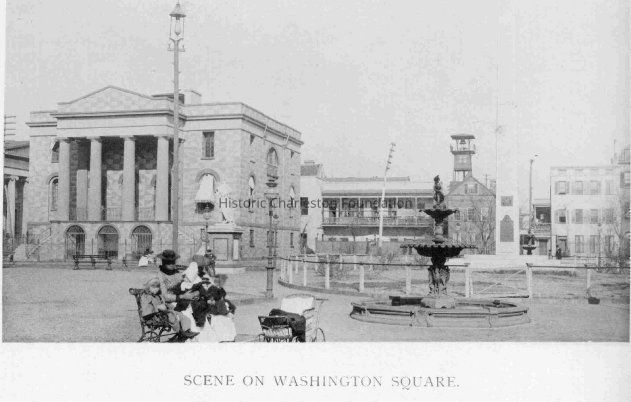 View of Washington Square Park, featuring a nanny with two small children seated in the foreground and the Fireproof building and the Meeting Street fire tower in the backgroundContext