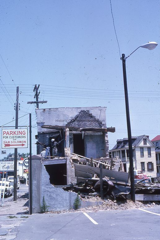 a: View of the Pure Service Station at 474 East Bay Street photographed from behind a building being demolished, probably 41 Calhoun Street (SE corner of Calhoun and East Bay). Houses in view at the right are probably 40 Calhoun Street and the edge of 38 Calhoun Street.* Slide stamped June [19]64.