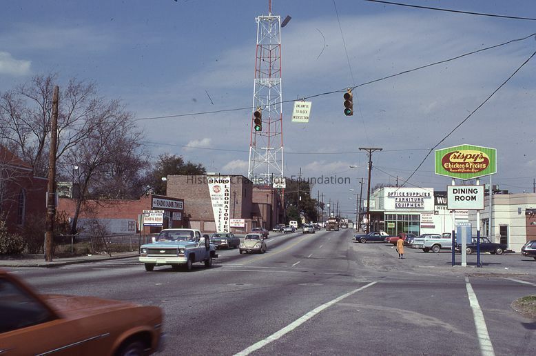 b: View of East Bay Street looking north from Calhoun Street. Features Radio Laboratories (475 East Bay) and the WCSC station and tower (485 East Bay) at left, and Crispy's Chicken & Fixins (476 East Bay) and Wulbern Koval Office Supplies (478 East Bay) at right. Slide stamped Mar [19]79.