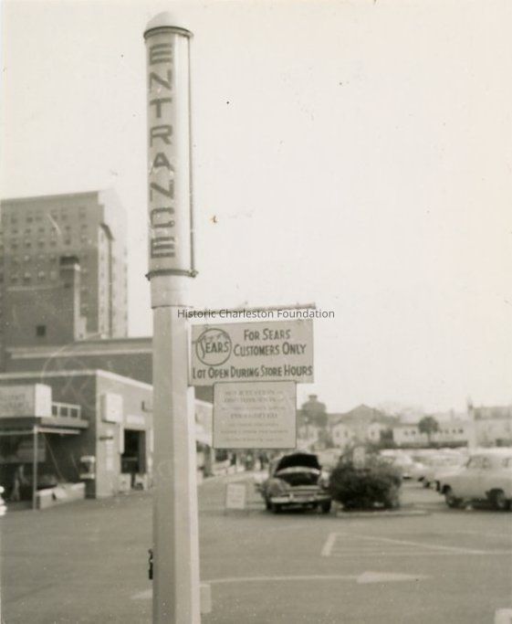 a: View across the Sears parking lot from the Vanderhorst Street entrance. Sign projects from the entrance post, "For Sears Customers Only. Lot Open During Store Hours." Captioned on back "[top of caption cut off] ...to park 5 more cars by Sears Roebuck. Gabriel Manigault. Classified as one of the 26 bldgs of national significance in the city."
