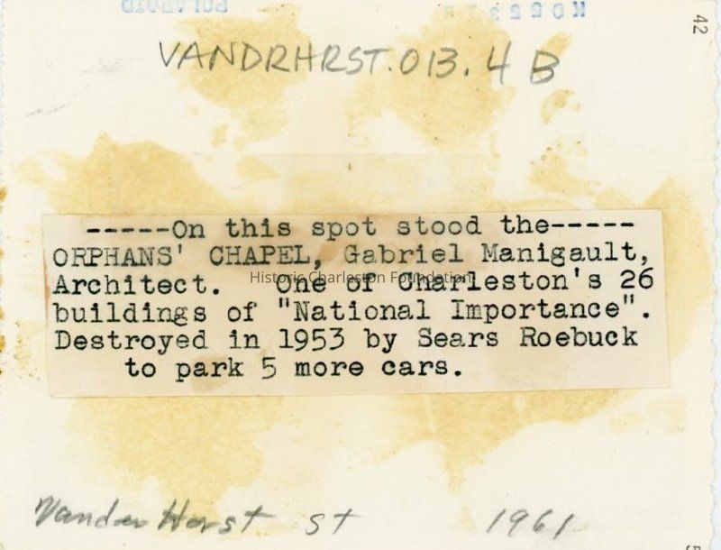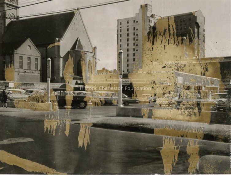b: View of the parking lot from across the street. South side of St. Matthews Lutheran Church and rear of the Francis Marion Hotel in background. Photo partially damaged, obscuring portions of the photo. Captioned on back "On this spot stood the Orphans' Chapel, Gabriel Manigault, Architect. One of Charleston's 26 buildings of "National Importance. Destroyed in 1953 by Sears Roebuck to park 5 more cars."