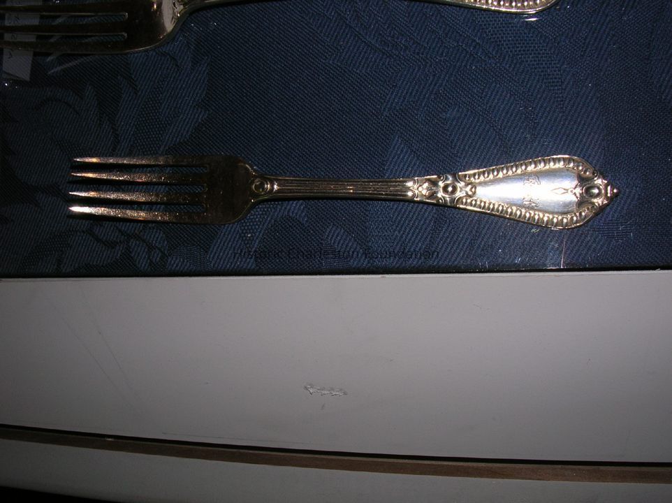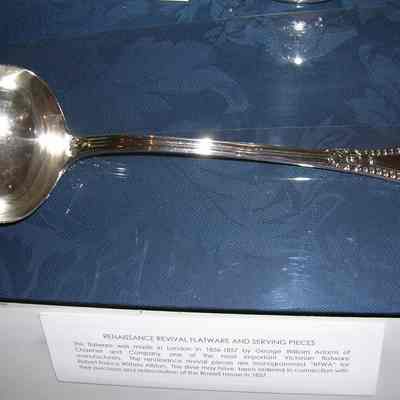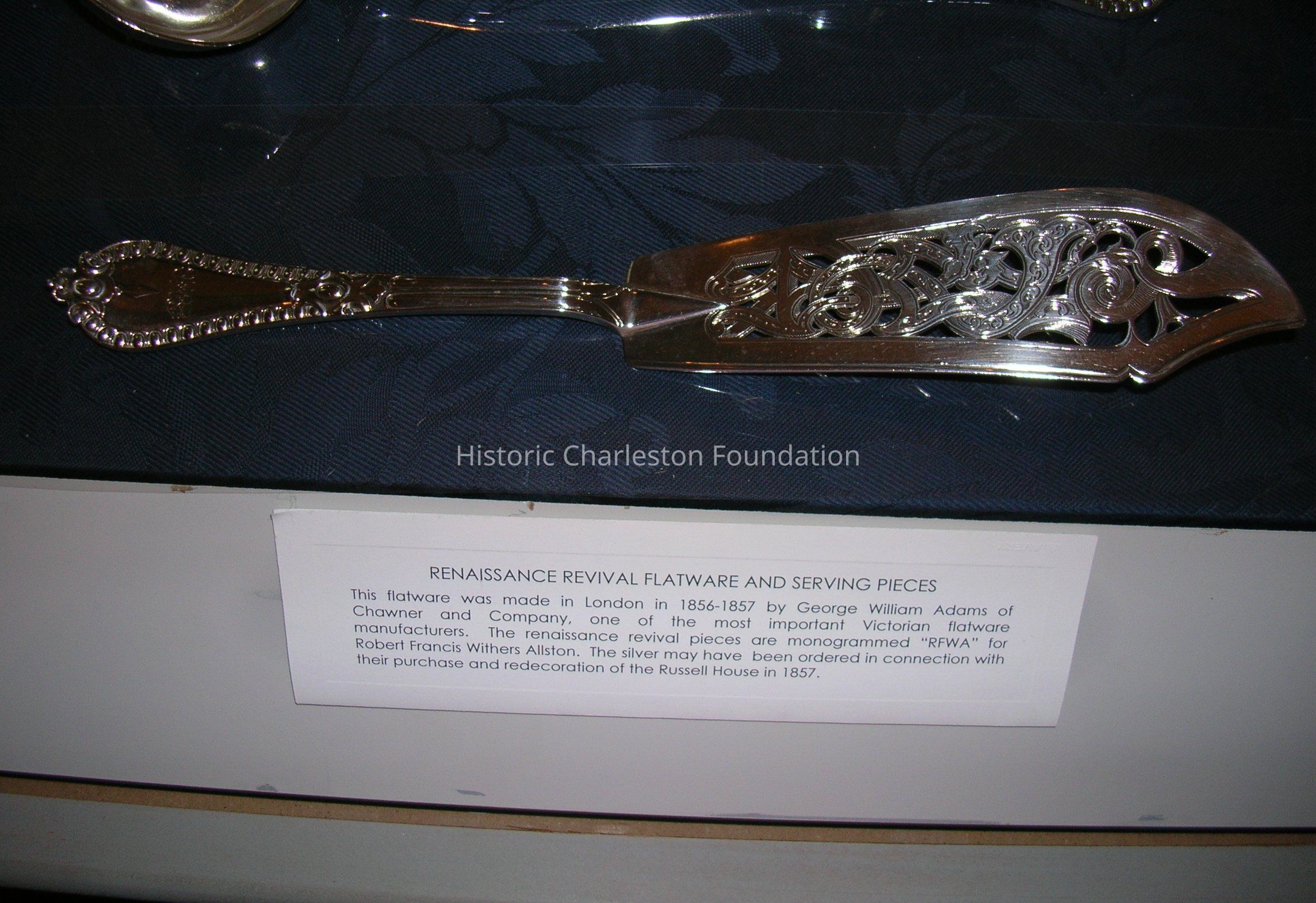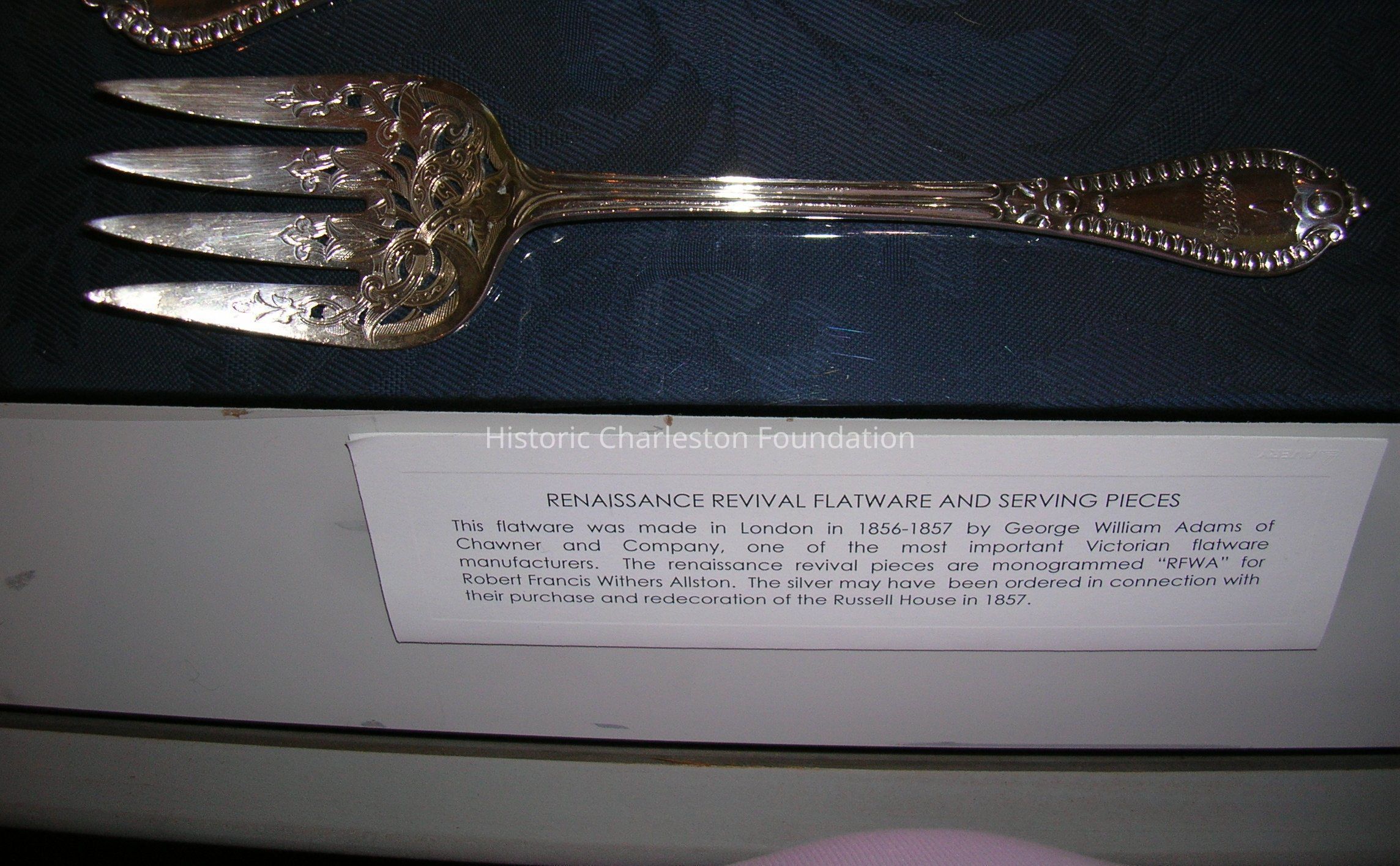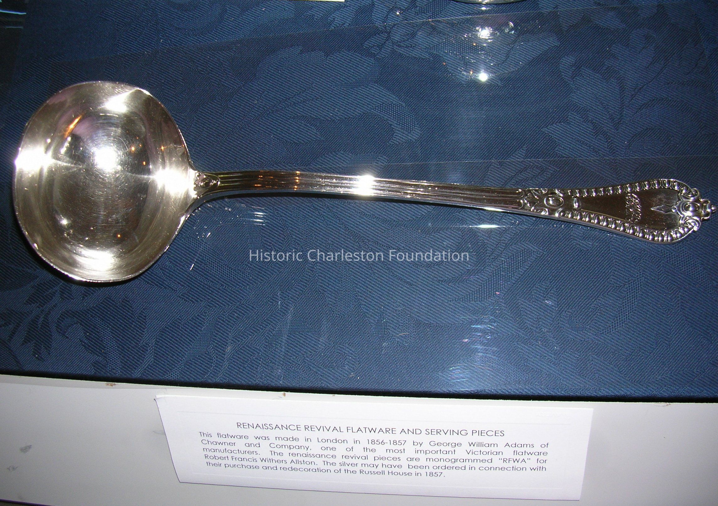 Service of Renaissance Revival Flatware made by George W. Adams of Chawner & Co., London. Dates from 1856-57. Consists of four tablespoons [96.1.6 a-d], four dinner forks [96.1.7 a-d], eight dessert/oval soup spoons [96.1.8 a-h], three salad forks [96.1.9 a-c], one fish slice [96.1.10], one fish fork [96.1.11], one punch ladle [96.1.12], and seven teaspoons [96.1.13 a-g]. Marked with a lion passant, leopard head,a, Queen'sHead duty mark, maker's mark GA with conjoined circles around it. Monogrammed RFWA.