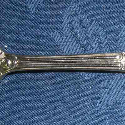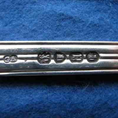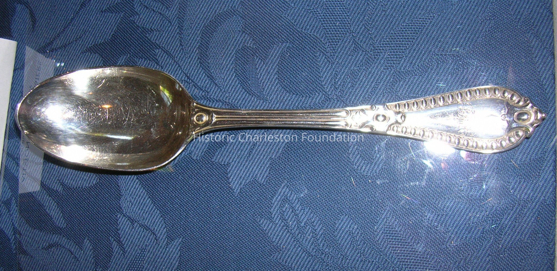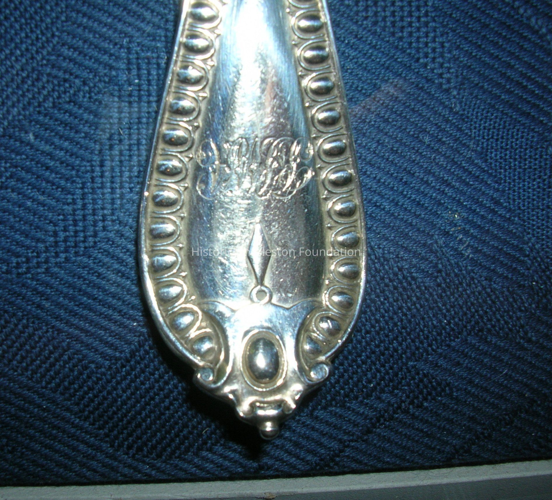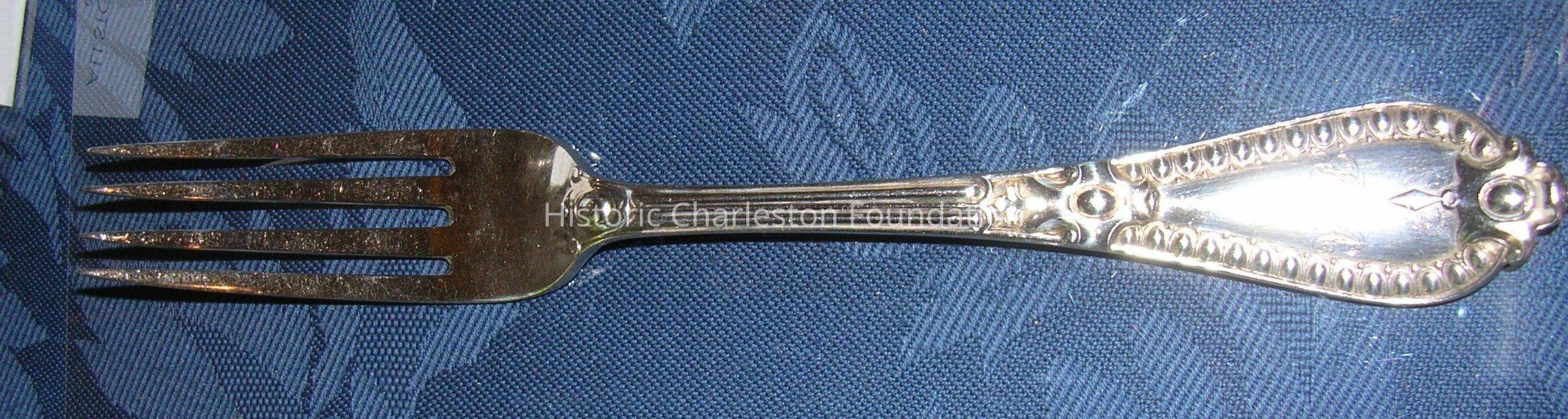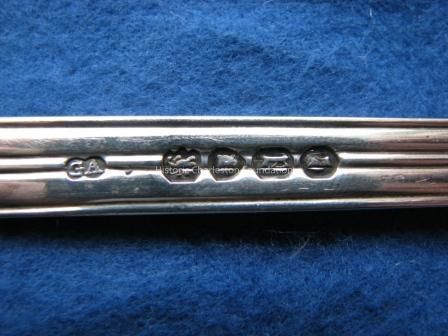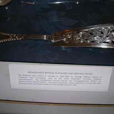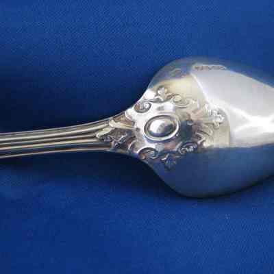 Service of Renaissance Revival Flatware made by George W. Adams of Chawner & Co., London. Dates from 1856-57. Consists of four tablespoons [96.1.6 a-d], four dinner forks [96.1.7 a-d], eight dessert/oval soup spoons [96.1.8 a-h], three salad forks [96.1.9 a-c], one fish slice [96.1.10], one fish fork [96.1.11], one punch ladle [96.1.12], and seven teaspoons [96.1.13 a-g]. Marked with a lion passant, leopard head,a, Queen'sHead duty mark, maker's mark GA with conjoined circles around it. Monogrammed RFWA.